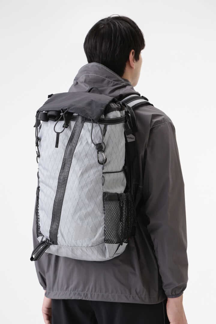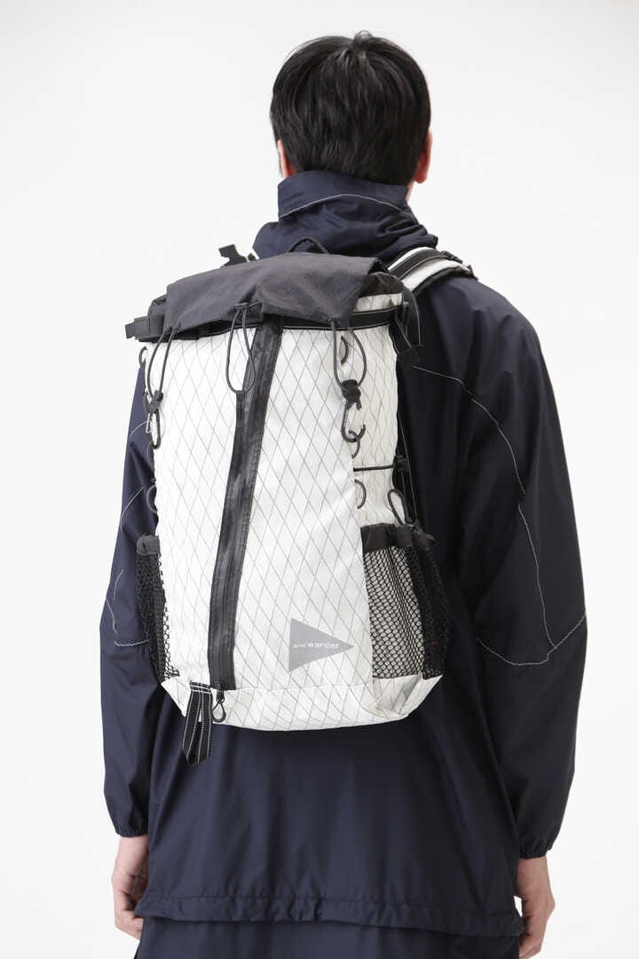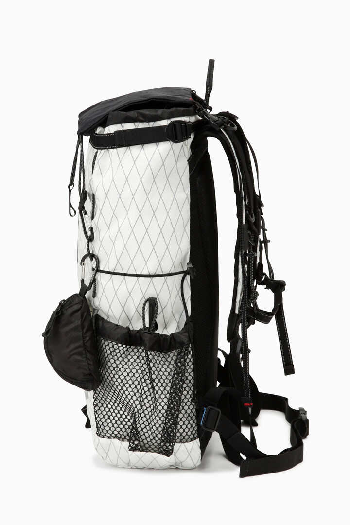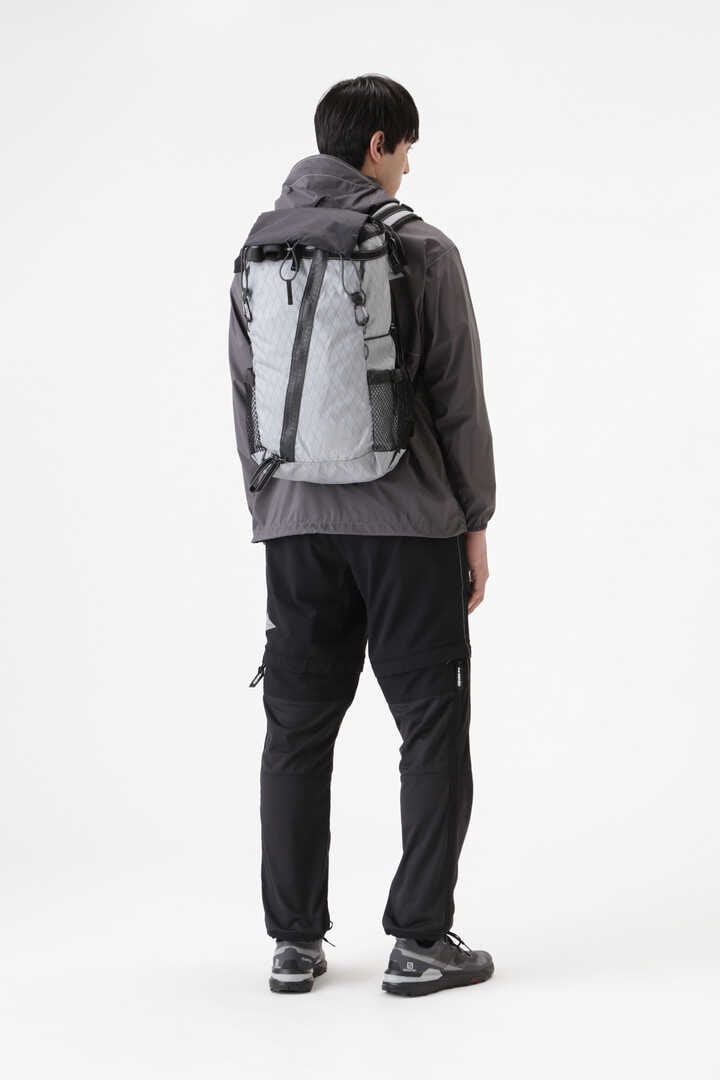 Lightweight backpack using DIMENSION POLYANT X-Pac fabric. X-Pac is a material developed as a sail cloth and has excellent durability and water resistance of over 10,000mm. Combined with silicone-coated Cordura nylon material from INVISTA. The rain lib can be used as a map pocket as a front bag. Actual measured capacity 21-31L, toplid 2L